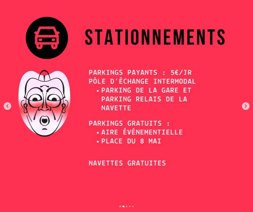Pour ce Festival du Théâtre de rue d’Aurillac, le stationnement évolue dans la ville. Les parkings de la gare (158 places) et de la navette (201 places) du pôle d’échange intermodal seront payants sur toute la durée du Festival. Le tarif a été fixé à 5 € par jour. En revanche, le parking du 8 Mai deviendra gratuit, et le parking du cours d’Angoulême sera réservé aux commerçants non sédentaires.