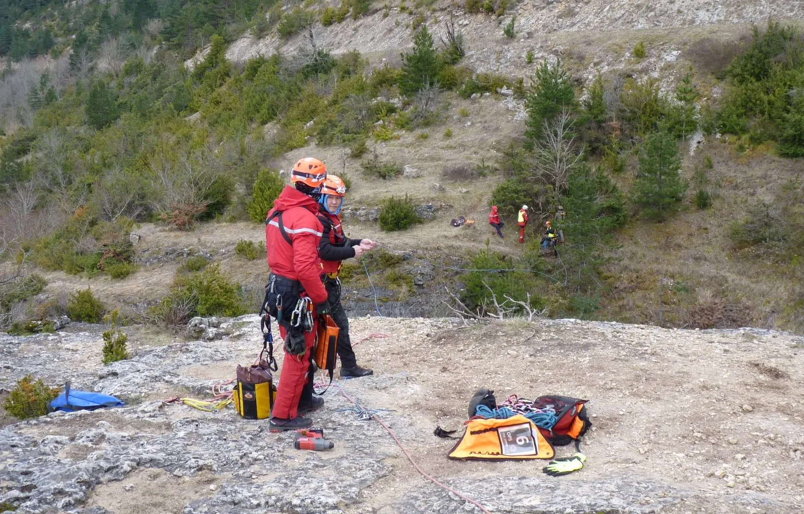 C'est dans le bois de Gentil, à l'aplomb du ravin des Courtiols que je retrouve un groupe d'une dizaine de pompiers en plein exercice. La vue est magnifique sur la vallée, mais le vent souffle par rafales. Aiguy est l'un des deux Mongols en formation. C'est lui qui mène la manœuvre. L'adjudant-chef Romuald Canonne est le formateur :