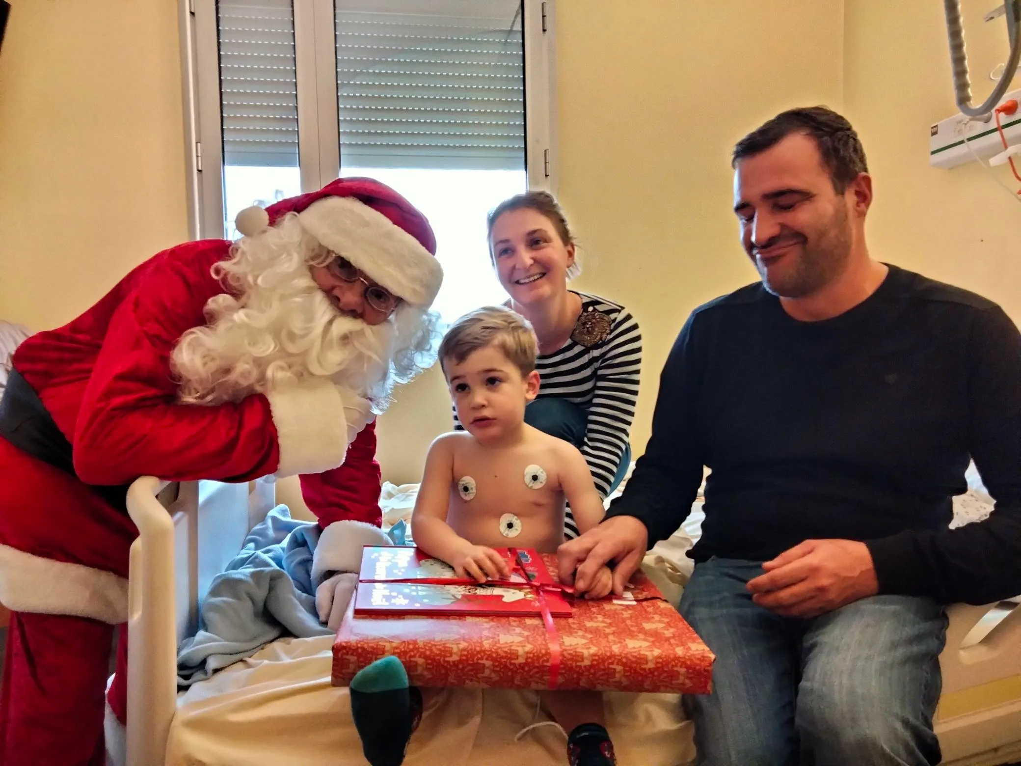 Ce mardi 19 décembre, plusieurs enfants malades et leurs parents admis au service pédiatrie de l’hôpital de Montauban ont reçu la visite du Père-Noël. L'homme à la barbe n’est pas venu seul puisque plusieurs sportifs de haut niveau, des chanteurs et même Maelise Mommayou, 1e dauphine de Miss Tarn-et-Garonne sont venus l’accompagner. Des patchs électrodes sur le corps, le petit Raphaël reste bouche bée devant la visite surprise du Père-Noël. Ses parents, Alexandre et Pauline en ont les larmes aux yeux :