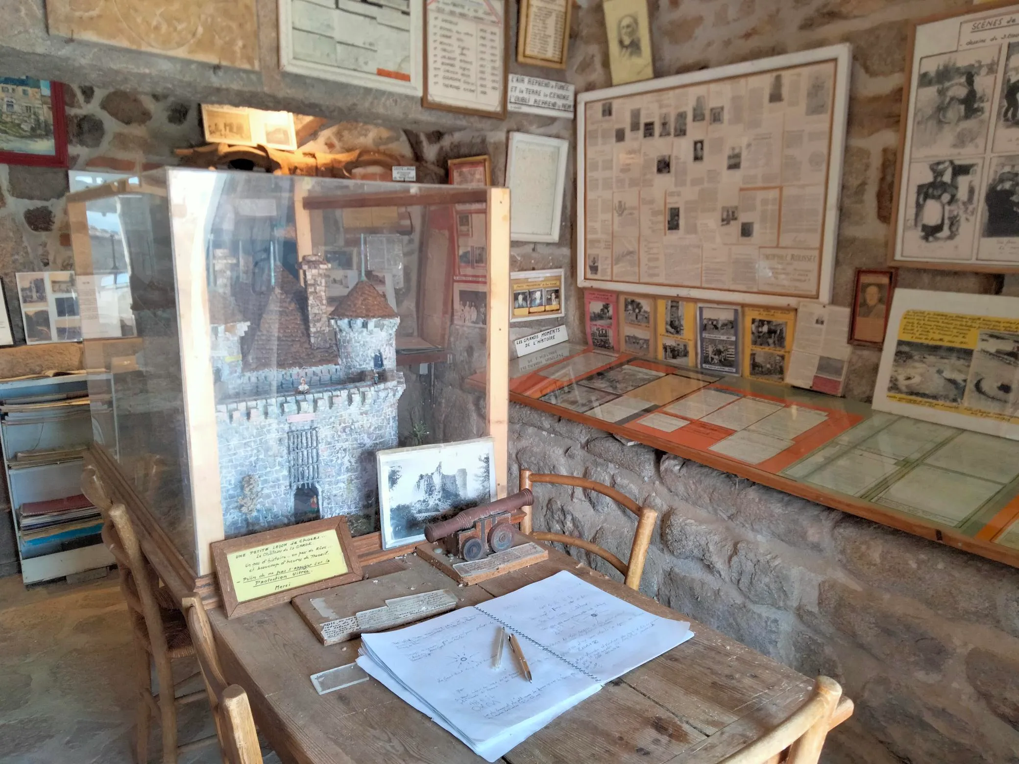 Dans le petit espace, on trouve pêle-mêle des photos, des documents d'archives, des tickets de rationnement, une maquette du Château de la Garde, des outils, un blason, un nid d'oiseau...