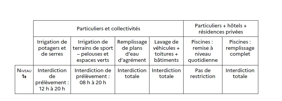 Cet arrêté est aussi assorti de mesures pour les communes, les entreprises et les particuliers basés dans des communes des bassins du Tarn et de la Garonne. Pour l'heure, le niveau 1B a été activé. Cela entraîne des restrictions totales ou partielles pour l'arrosage, le lavage des véhicules et surtout le remplissage des piscines.