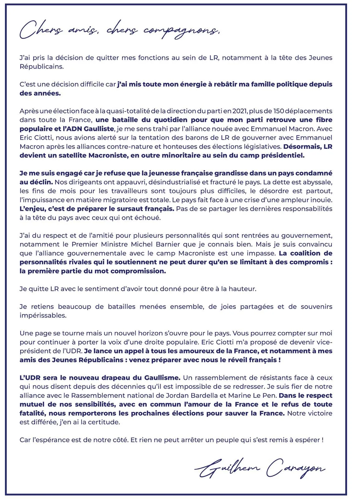 "En désaccord total avec la coalition gouvernementale nouée avec Emmanuel Macron, je prends mes responsabilités en cohérence avec mes convictions. Ma lettre pour les militants des Républicains". C'est avec ces mots publiés sur son compte X que Guilhem Carayon annonce ce mardi 24 septembre sa décision de quitter son mouvement politique et son poste de président des Jeunes Républicains.