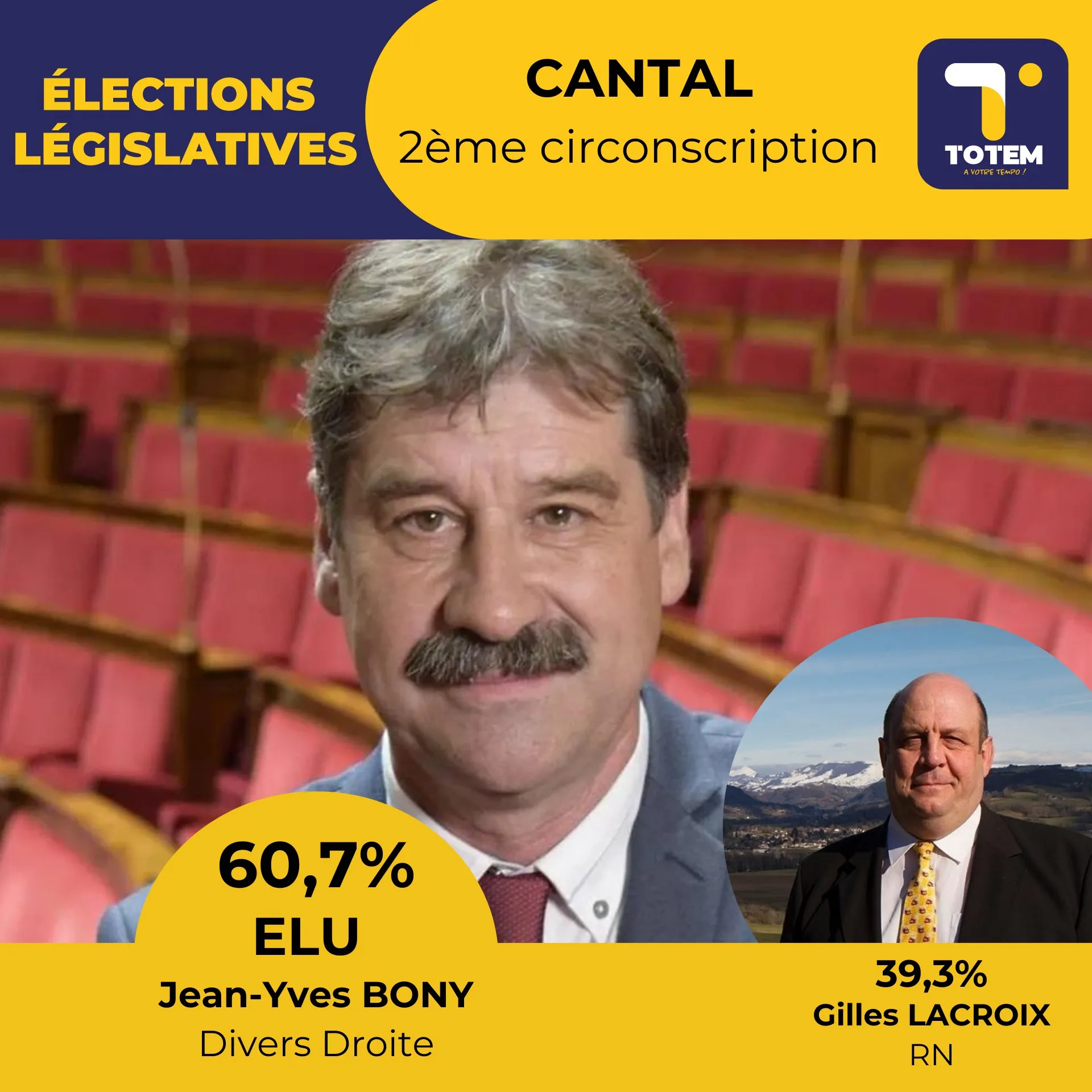 Dans la deuxième circonscription du Cantal, celle de Saint-Flour, le député sortant Jean-Yves Bony est réélu. Il obtient 60,7% des suffrages, face à son adversaire du RN Gilles Lacroix qui obtient 39,3%. Le candidat Divers droite Jean-Yves Bony double presque son score, alors que le candidat RN Gilles Lacroix ne prend que 5 points de plus. Le front républicain a lui aussi fonctionné sur cette circonscription cantalienne.