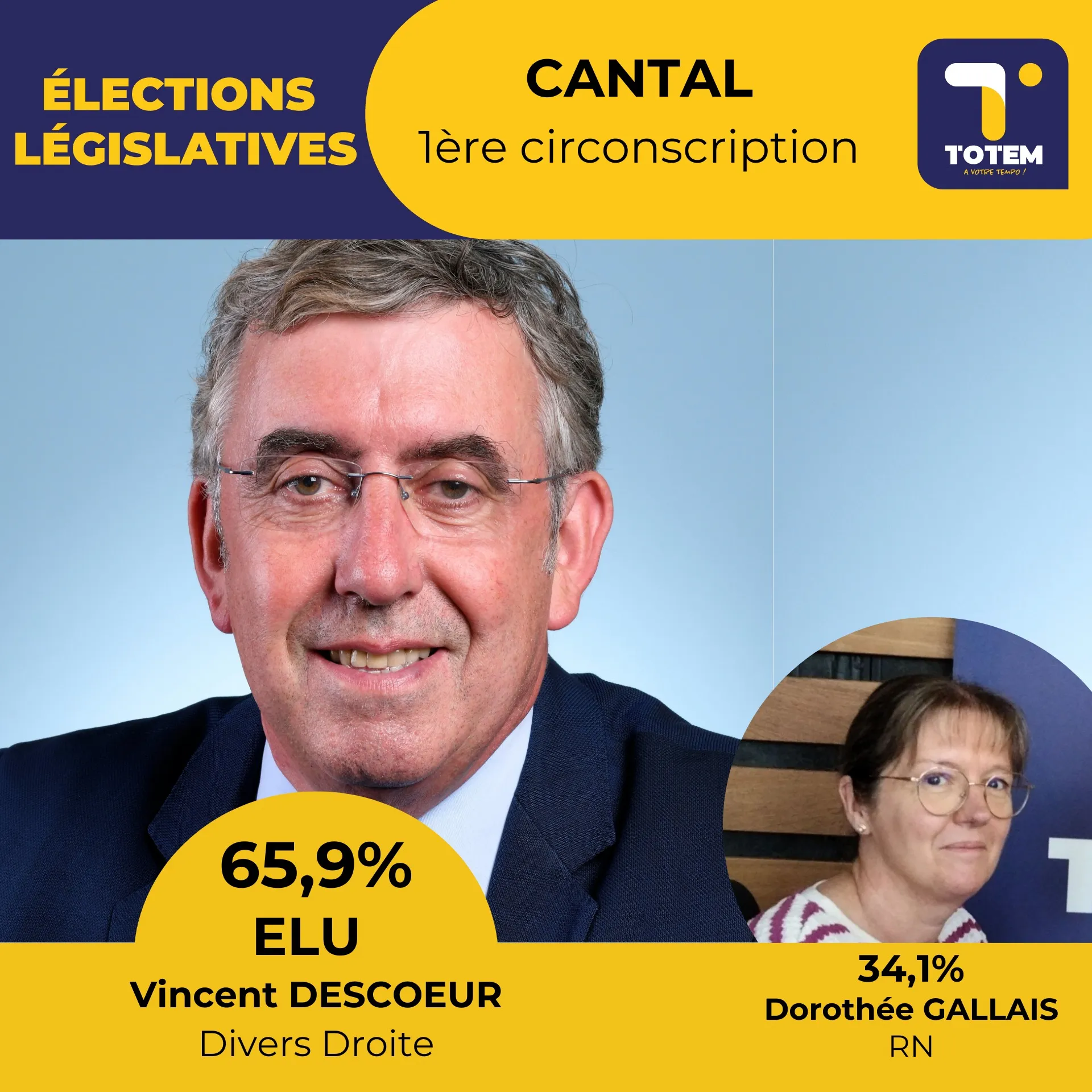 - A Aurillac, carton plein pour Vincent Descoeur (DVD) avec 72,1%, contre 27,9% pour la candidate du RN Dorothée Gallais.