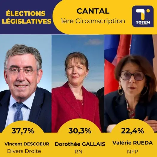Dans le Cantal, Vincent Descoeur se qualifie pour le second tour avec 37,7% des suffrages. Il est talonné par la candidate RN Dorothée Gallais avec 30,3% des voix. Depuis l'élection de 2022, la candidate gagne tout de même environ 9600 voix. La candidate Valérie Rueda, PS pour le Nouveau Front Populaire s'est qualifiée elle aussi pour ce second tour avec 22,4%.