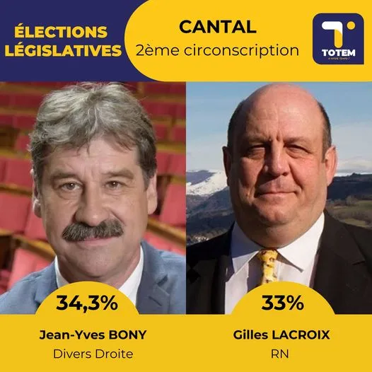 Dans le Cantal, Jean-Yves Bony le député sortant est en tête avec 34,3%, suivi du candidat RN Gilles Lacroix avec 33%. En troisième position, c'est la candidate NFP Zoé Pébay qui récolte 13,6%, pas suffisant pour se qualifier au second tour, car elle récolte que 9,4% de voix des inscrits.