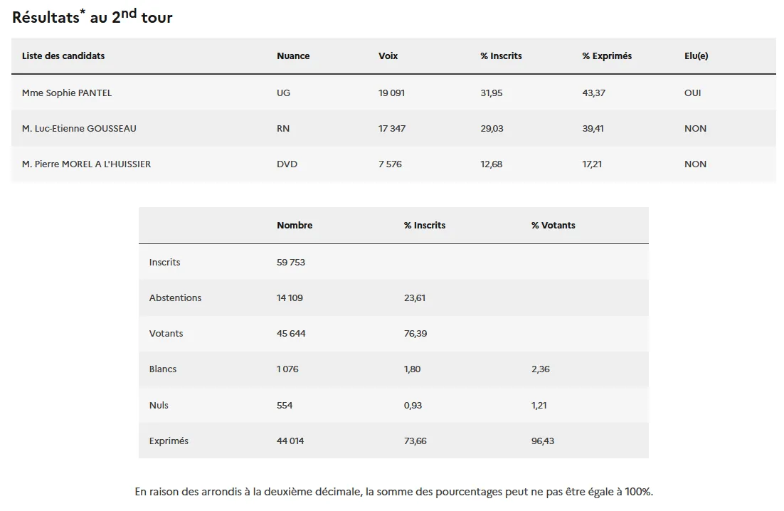 Les résultats partiels donnés dans un premier temp ont été confirmés en Lozère. Sophie Pantel est élue députée, la présidente du département, représentante du NFP (PS) obtient 43,37% des voix, devançant le candidat du RN Luc Etienne Gousseau à 39,41%. Elle devra de fait, quitter son poste au département.