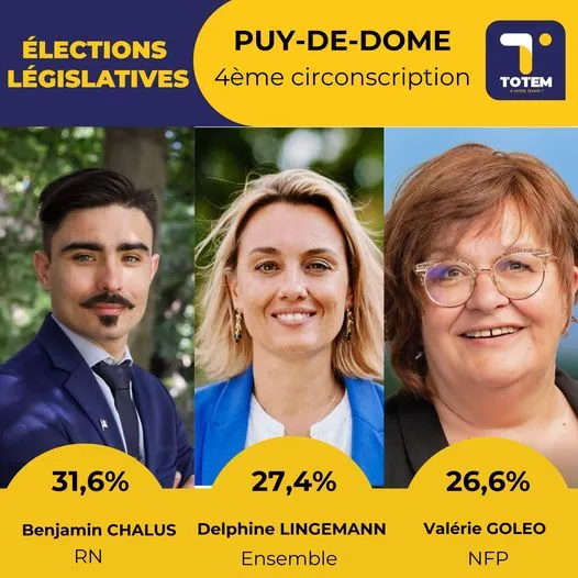 Sur la 4ème circonscription du Puy-de-dôme, qui englobe Issoire et Cournon, cest le RN qui fait une percée avec son candidate Benjamin Chalus, qui obtient 31,6% des suffrages. Il est suivi par la député sortante Delphine Lingemann, sous l'étiquette Ensemble avec 27,4%. En 3ème position et dans la triangulaire qui attends cette 4ème circonscription pour l'instant, on retrouve Valérie Goléo avec 26,6% des voix, candidate Nouveau Front Populaire.