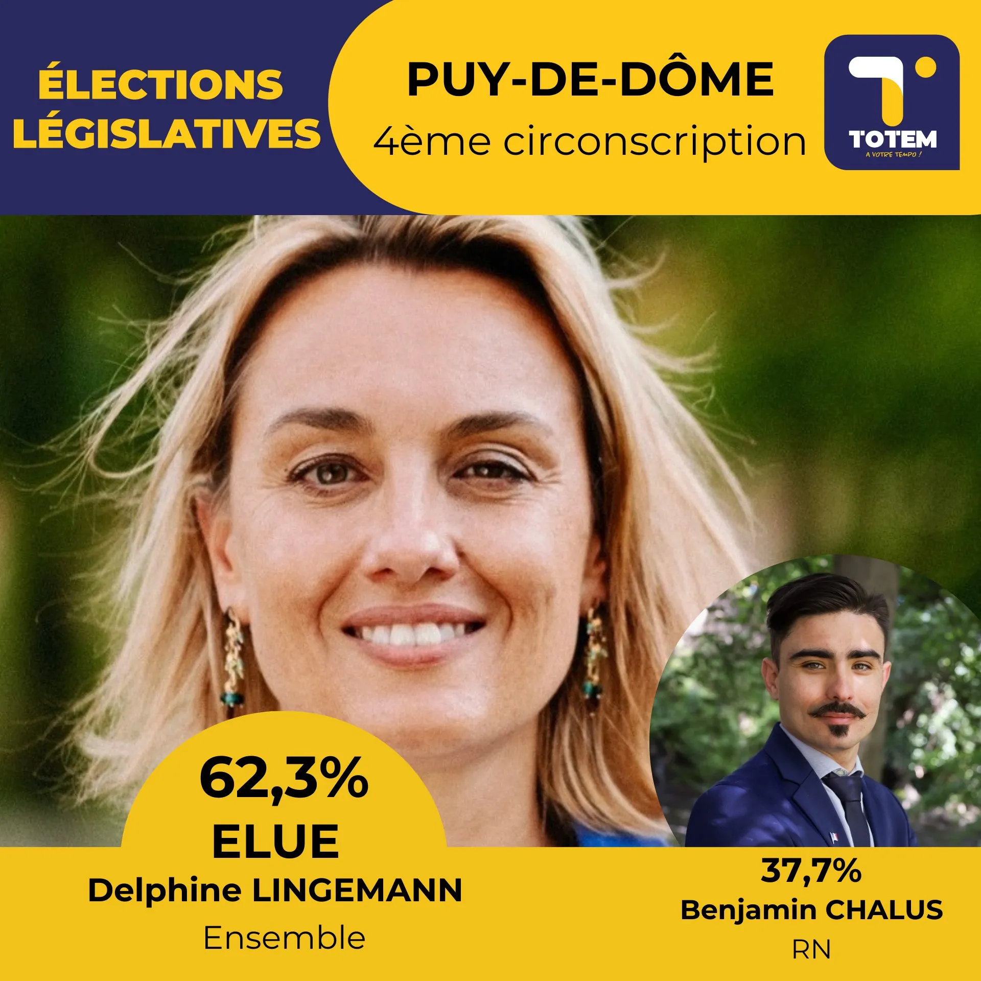 Dans le Puy-de-dôme et la 4ème circonscription, celle d'Issoire, la députée sortante macroniste Delphine Lingemann retrouve son siège de député avec 62,3% des suffrages. Le candidat RN Benjamin Chalus est battu à 37,7%