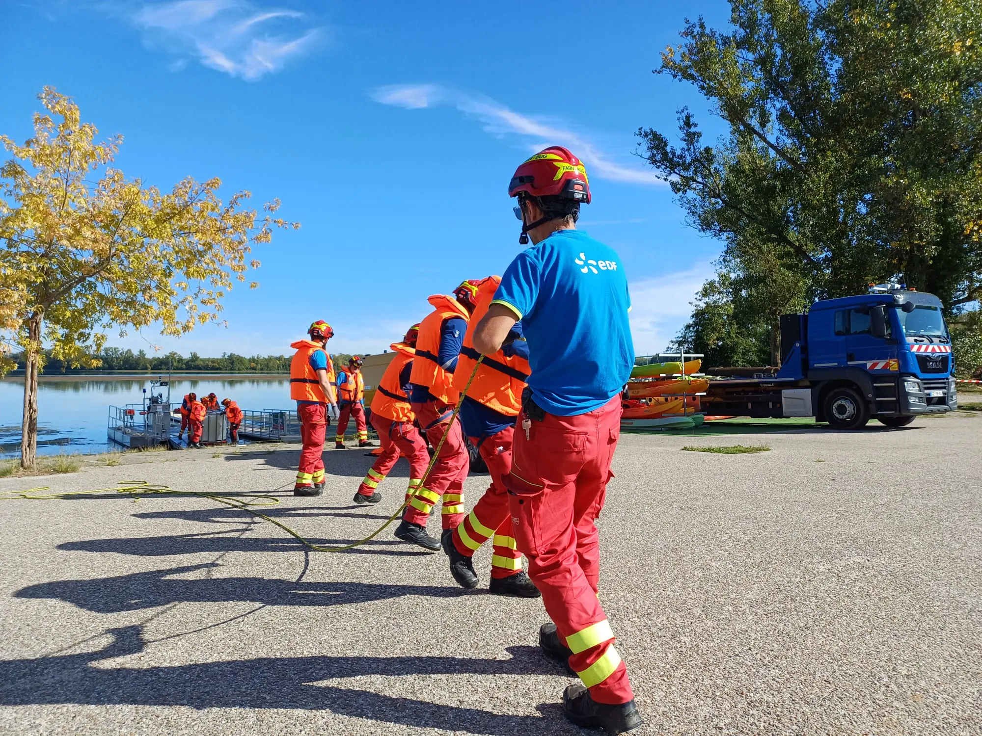 Vêtus en rouge et non en bleu comme leur collègues d’EDF les équipiers de la Force d’Action Rapide du Nucléaire (FARN) naviguent sur la rivière Garonne direction la base de loisirs de Saint-Nicolas-de-la-Grave située à une vingtaine de kilomètres de Golfech.