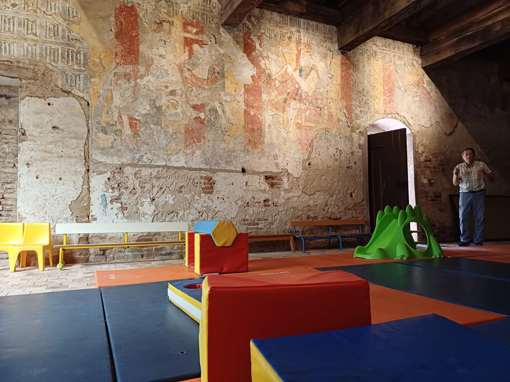 Preuve qu’on peut concilier patrimoine et éducation, ici les tapis de motricité des petits de la maternelle ont été installés dans la salle d'honneur. Celle-ci donne accès aux oubliettes (protégées par une grille heureusement) et présente des fresques du début du XVIème siècle avec des chevaliers dont une figure de Charlemagne en habit d'apparat se rendant à un tournoi imaginaire. Gabriel Serra y voit tout un symbole :