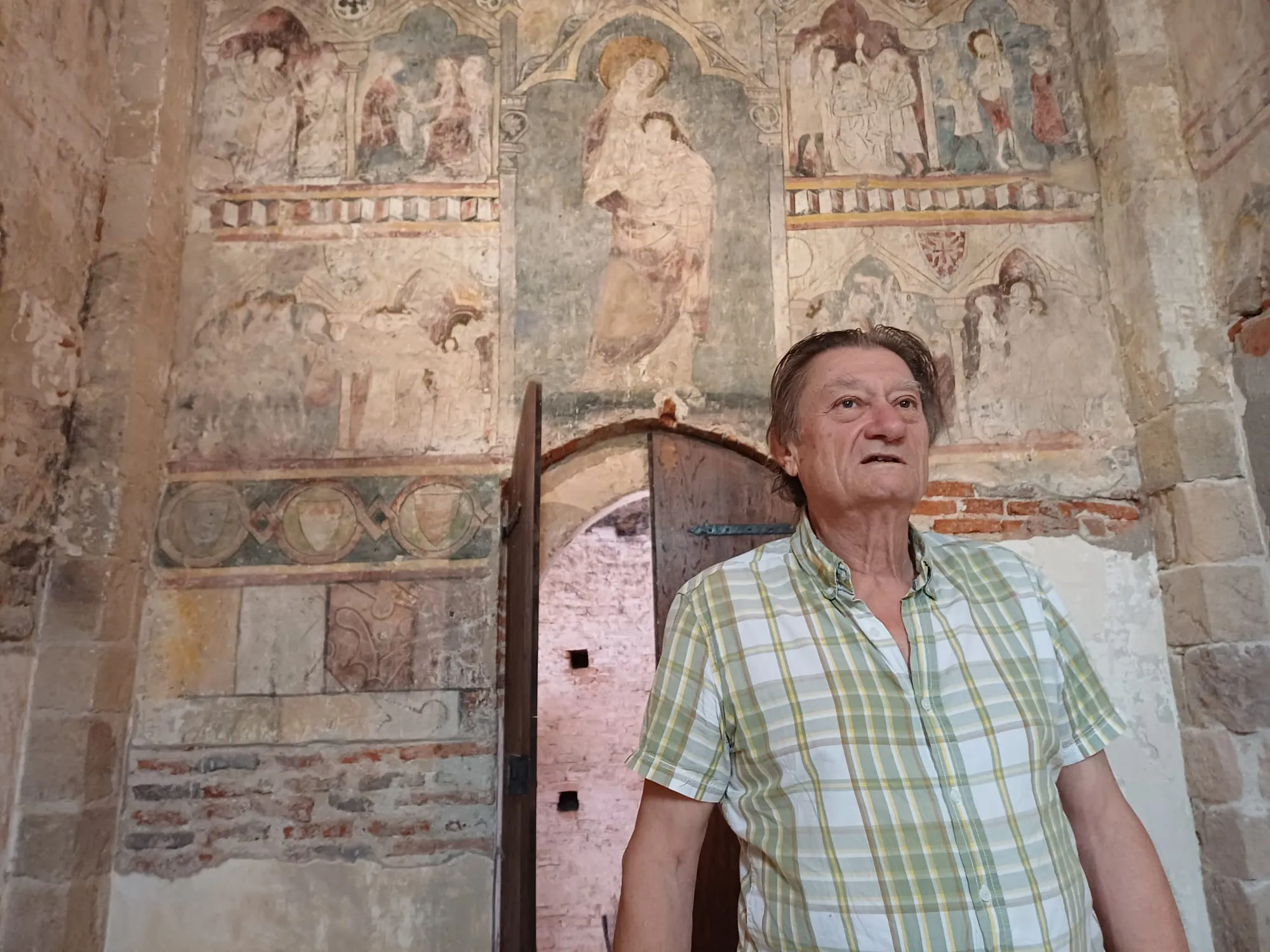 "Ces fresques sont uniques au monde. On y voit la vierge à l'enfant ce qui est classique mais ces scènes de la vie de Jésus de cette époque, c'est rare. Dans les années 50, il y a une restauration. Ça a été recouvert d'un produit pour le conserver. Malheureusement, il y a moins de 10 ans, ce produit s'est rétracté en se rétractant il a détruit la peinture. Il y a un travail énorme à effectuer. Il faut envoyer des échantillons dans des laboratoires à Marseille pour reconnaître le grain exact et savoir quel produit était utilisé à l'époque. Il s'agit de ne pas mettre n'importe quoi. C'est quelque chose de très minutieux, très long, très coûteux aussi."