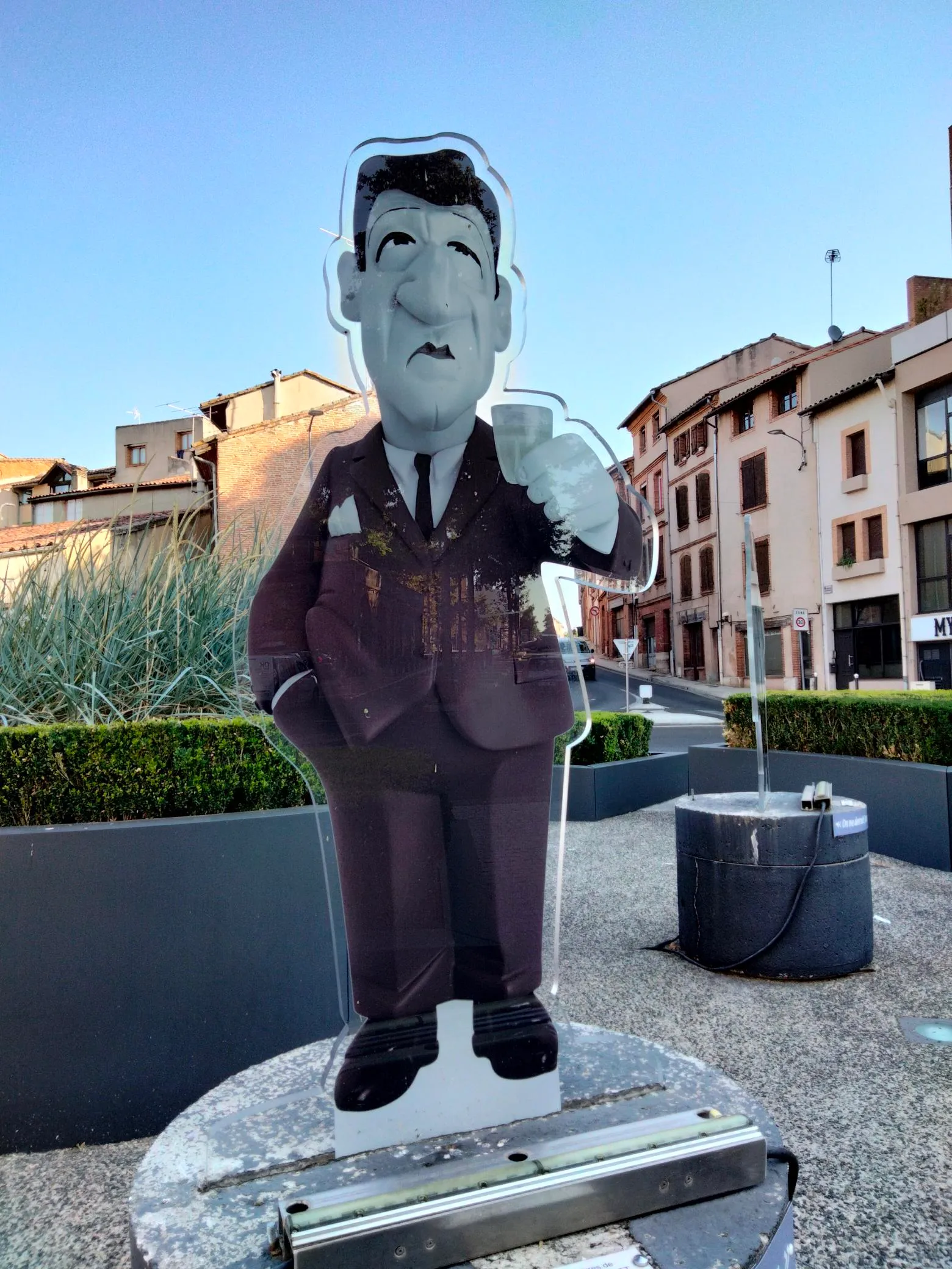 Encore un coup des Volfoni ? Ou plutôt du soleil de plomb de ses derniers jours. Une chose est sûre : le rond-point des Tontons Flingueurs n'a pas fière allure. Les figurines en plexiglass sont de moins en moins visibles. Les photos inspirées des sculptures de Stéphane Saint-Emett sont en train de s'écailler au point que certains personnages sont tout bonnement méconnaissables. C'est le cas du pauvre majordome Jean joué dans le film par Robert Dalban. Le gugusse de Montauban, Lino Ventura, alias Fernand Naudin en a aussi pris pour son grade, c'est dire....