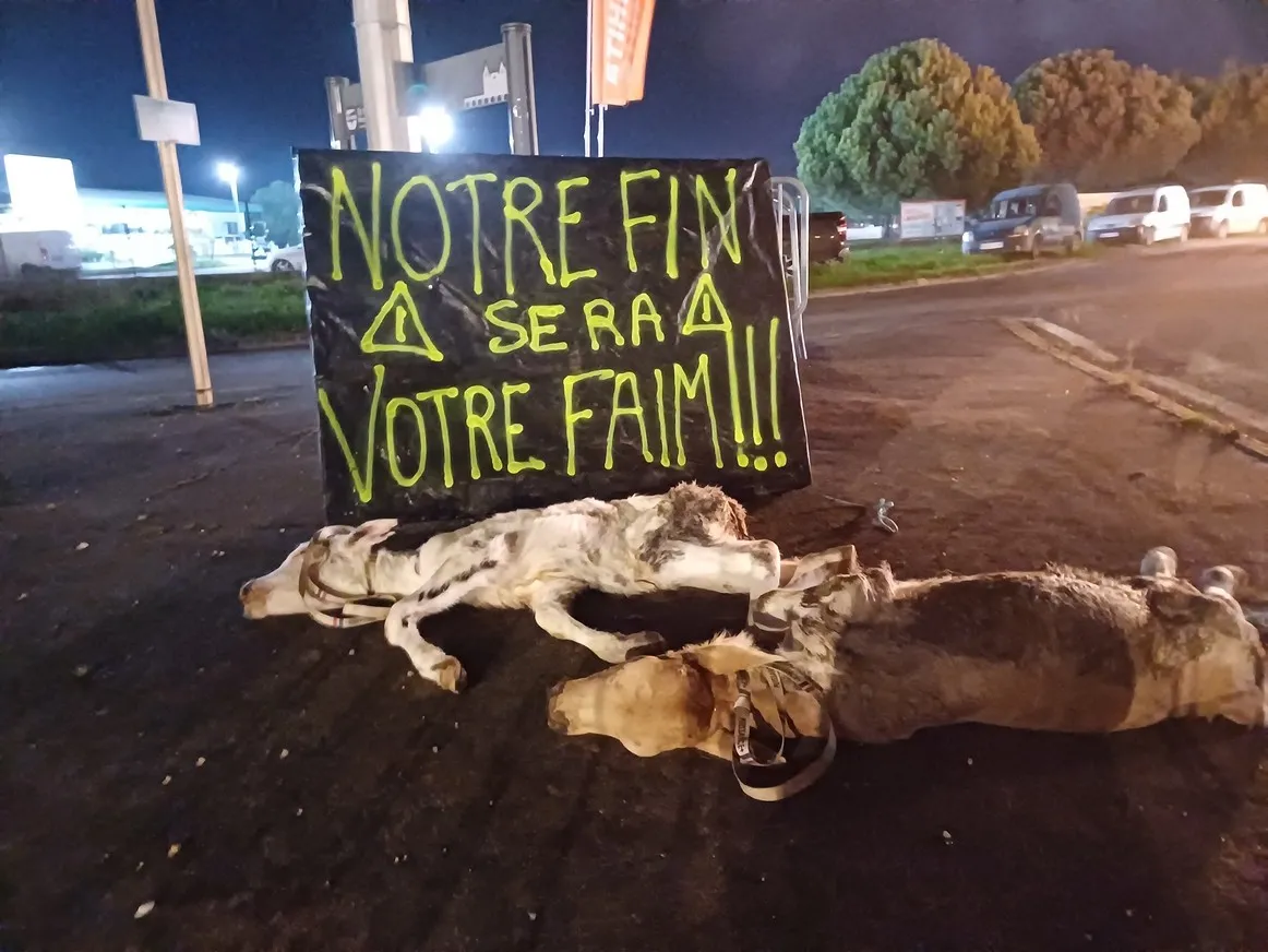 Moins d'un an après une mobilisation historique, les syndicats agricoles estiment que le compte n'y est pas. Ils ont à nouveau appelé leurs troupes à manifester ce lundi 18 novembre. 150 agriculteurs se sont réunis ce soir pour allumer un feu de la colère sur le principal rond-point du quartier commercial Albasud à Montauban. Une quarantaine de tracteurs ont convergé depuis Castelsarrasin, Caussade et St-Nauphary avec des palettes, des pneus et des bâches agricoles. Deux cadavres de veaux ont été déposés sur un terre-plein accompagnés du message "Notre fin sera votre faim".