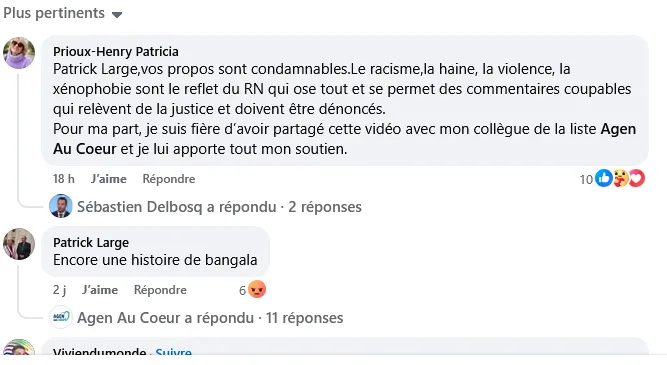 De son côté, Patrick Large fait l’objet d’une plainte pour injure raciste de Roberto Villeta candidat colistier de la liste "Agen au Cœur". Sur un post vidéo Facebook de présentation de ce colistier, Patrick Large a commenté "Encore une histoire de Bangala" (Le mot bangala signifie « sexe de l'homme, pénis ». Il fait le plus souvent référence à l'organe d'un homme à la peau noire. ndlr.)