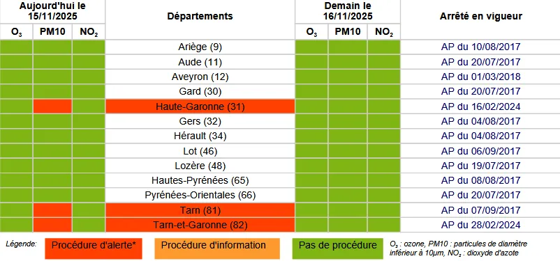 Ce samedi 15 novembre, l'organisme chargé de contrôler la qualité de l'air, Atmo Occitanie, maintient l’alerte à la pollution aux particules fines (PM10) sur les départements du Tarn, du Tarn-et-Garonne et de la Haute-Garonne. L’épisode, débuté la veille, est lié à l’arrivée d’une masse d’air chargée en poussières désertiques, provoquant une hausse significative des concentrations de particules en suspension.