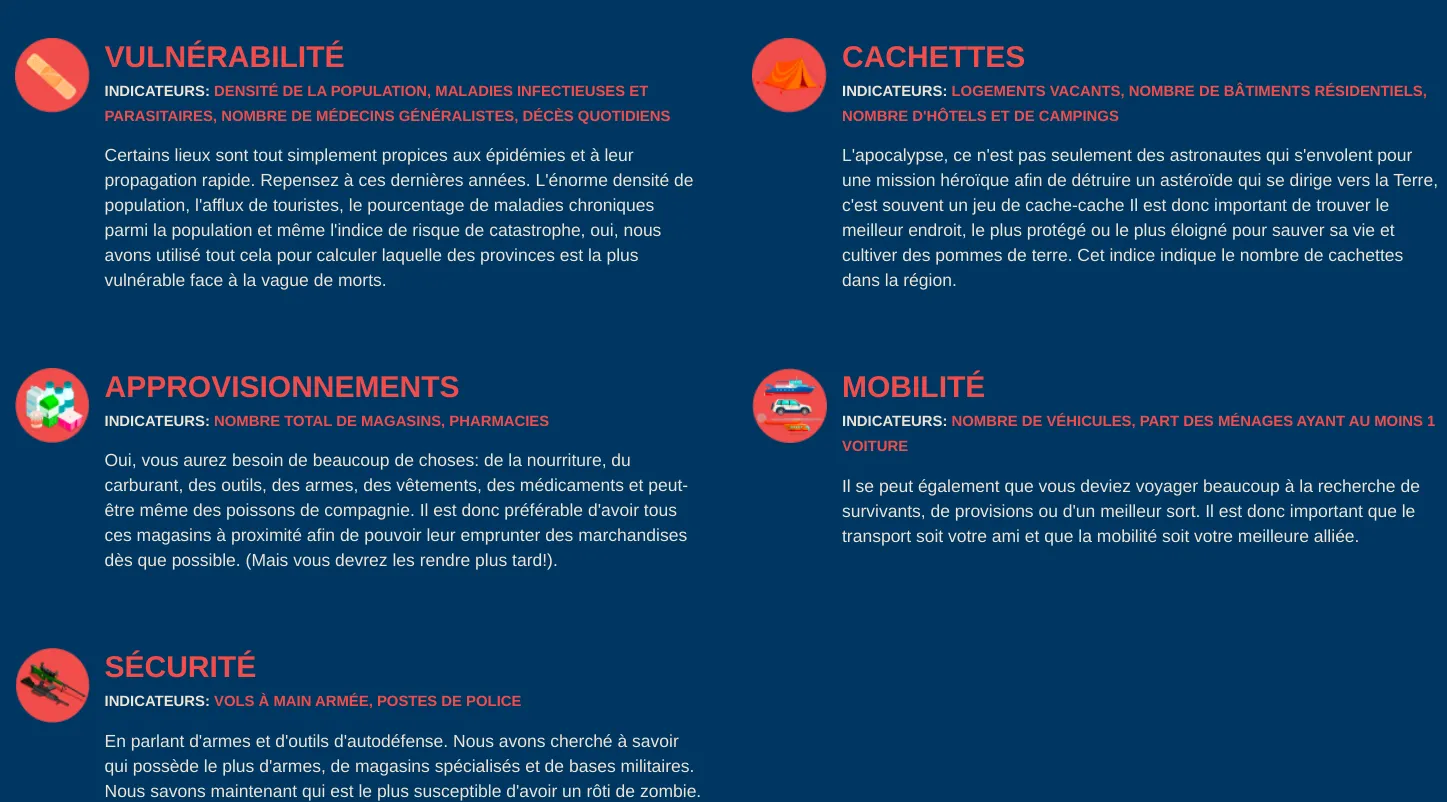 Pour identifier l'endroit le plus sécure en France, il a été analysé différents facteurs dans cinq catégories : Vulnérabilité, Cachettes, Approvisionnements, Sécurité et Mobilité. Les cinq catégories contiennent chacune un certain nombre de données considérées comme représentatives de la catégorie en question. Chacun de ces critères a été analysé et indexé pour chaque ville, après quoi un score moyen a été calculé.