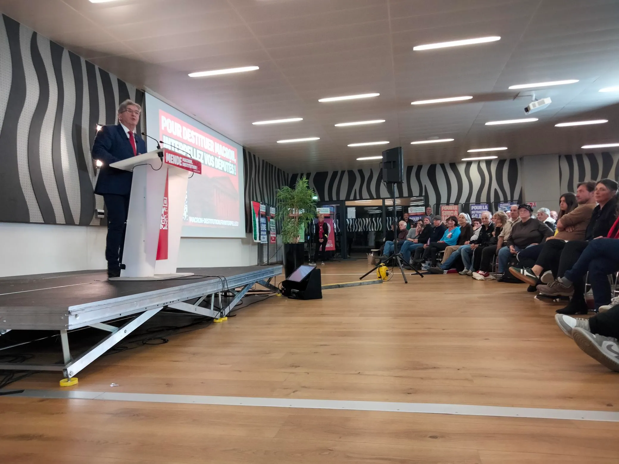 Jean-Luc Mélenchon a poursuivi son meeting sur le dépôt de la procédure de destitution du Président de la République. Il a, à ce sujet, remercié la députée Sophie Pantel d'avoir voté sa recevabilité, en tant que membre du bureau de l'Assemblée nationale et l'appelle à poursuivre dans ce sens. La procédure doit recevoir les deux tiers des votes de l'Assemblée nationale, avant d'être transmise au Sénat. Le public a été conquis.