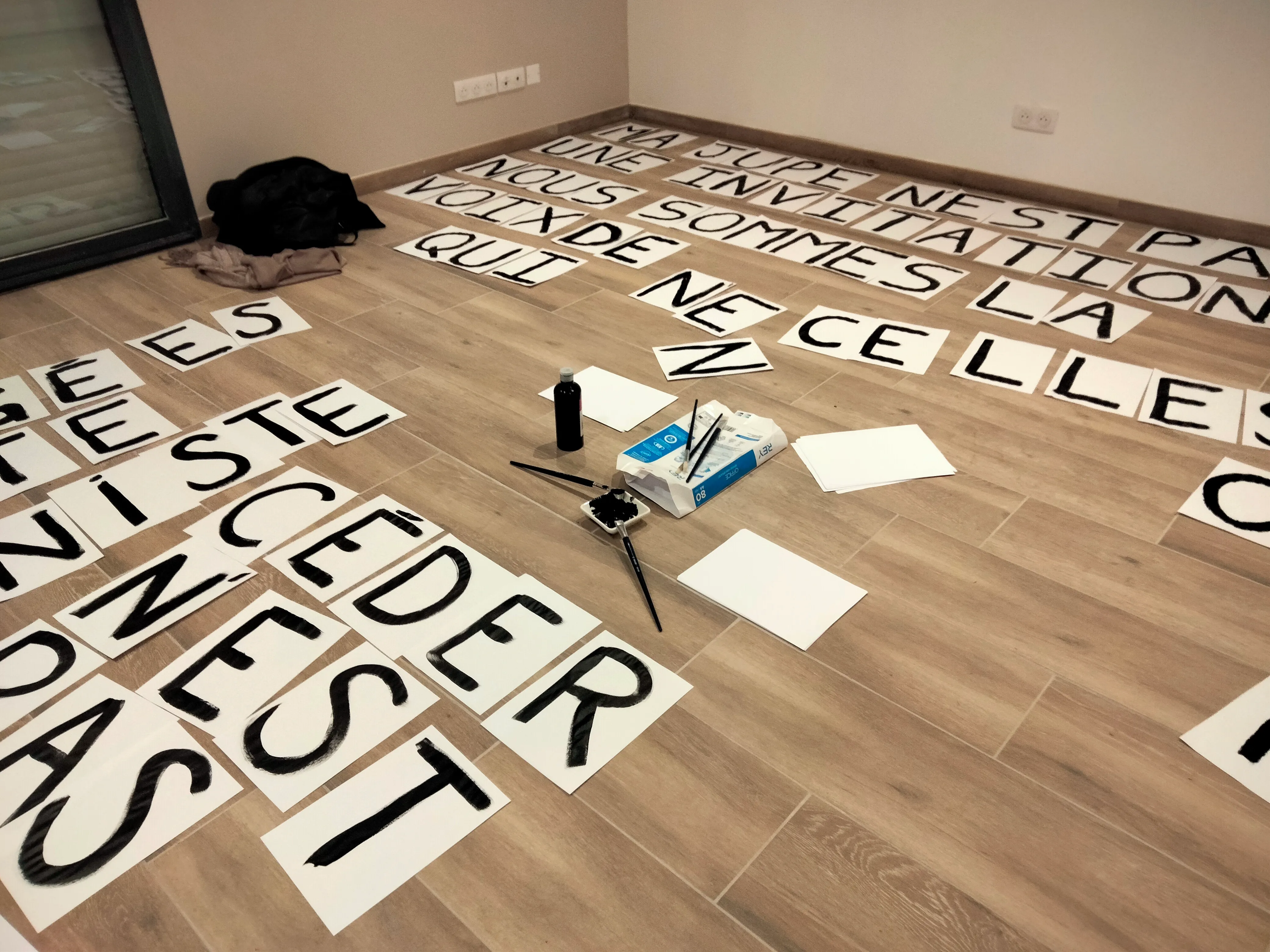Première étape, la préparation des affichettes des feuilles A4, de la peinture noire, des pinceaux et c'est parti. Chloé et Paula* sont à l'origine du groupe des colleuses féministes de Lozère.