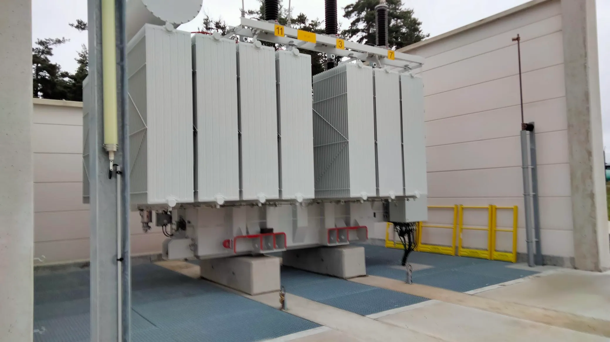 Avant d'arriver au transformateur, on va passer par différents équipements. On retrouve d'abord des combinés de mesure, puis un disjoncteur pour protéger le transformateur en cas de défaut. Le point névralgique du poste source est le transformateur où on va transformer les 63 000 volts en 20 000 volts.