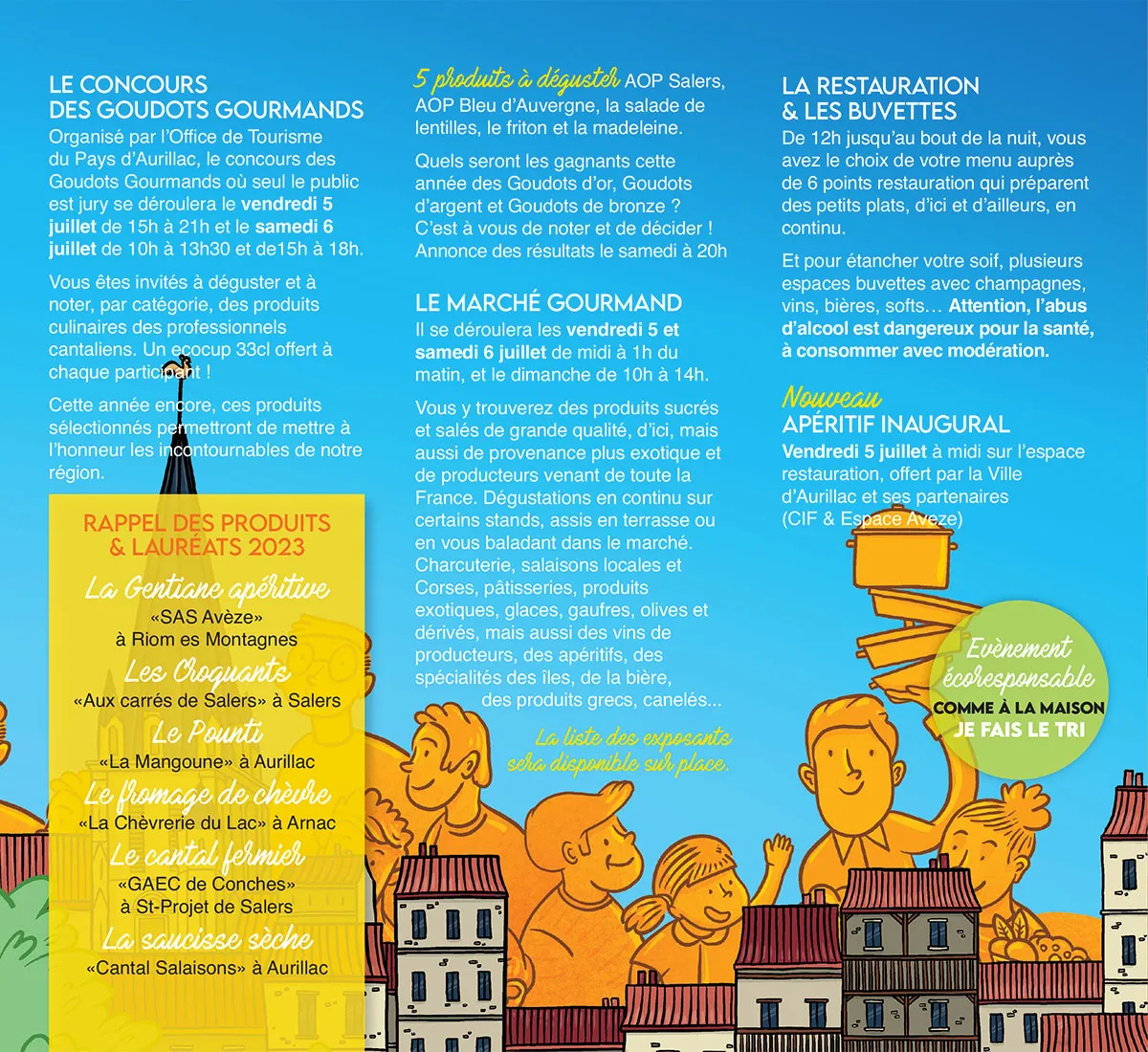 35 exposants sont annoncés pour le marché de producteurs. Le rendez-vous s'ouvre cours d’Angoulême à Aurillac avec un apéritif offert par la ville et ses partenaires sur l’espace restauration. Temps fort de l’événement, c’est le concours des Goudots qui permettra à un jury populaire de tester leurs papilles. Cette année, 5 produits seront sur le grill : Gentiane Apéritive, carrés de Salers, Pounti, fromage de chèvre, cantal fermier et saucisse sèche. Le concours de goudots est organisé par l’office de tourisme du Bassin d’Aurillac. Le festival des goudots c’est jusqu’à dimanche !