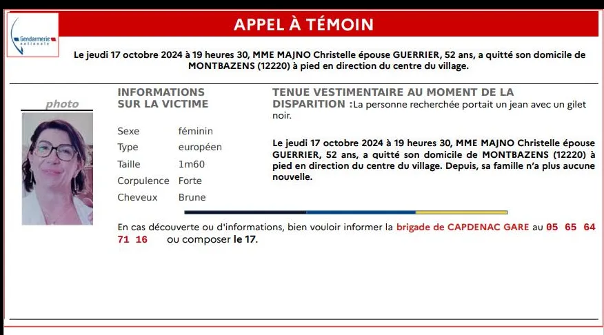 La gendarmerie de l'Aveyron a diffusé, ce vendredi 18 octobre, un appel à témoin. Il s'agit de retrouver une habitante de Montbazens qui a quitté son domicile ce jeudi 17 octobre à 19 h 30.