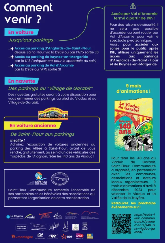 3 zones publiques seront mises en place pour admirer le feu pour des questions de sécurité. Attention pour des raisons de sécurité, il ne sera pas possible d’accéder au pont routier par Val d’Arcomie pour voir le spectacle pyrotechnique. Des navettes seront mises en place. Plus d’infos auprès de Saint-Flour communauté.