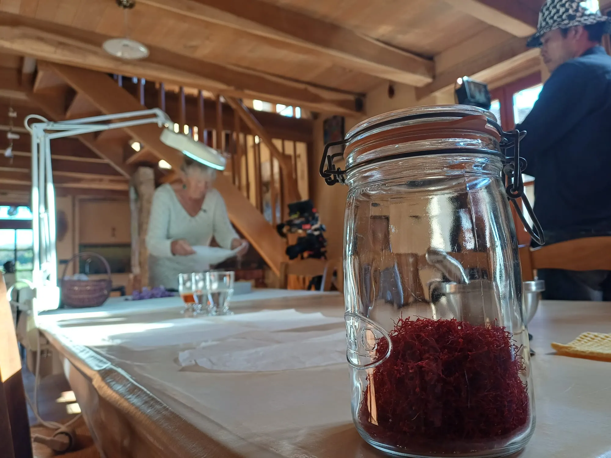 Devant les caméras, Denise Soulier récolte les premières fleurs avant de retirer chaque pistil. Pour obtenir 100 grammes il faut ramasser 10 000 fleurs. Heureusement, seuls quelques brins de "vrai safran" suffisent à parfumer les plats. Après la parcelle, direction ensuite la cuisine où l'équipe de NBS font réaliser à Denise Soulier une recette de chantilly safranée accompagnée de petits gâteaux. Car le sucré s’adapte très bien à l’épice, insiste la productrice :