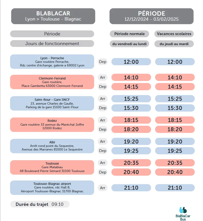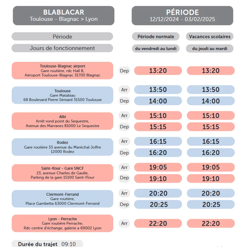 "Les billets sont disponibles à partir de 4,99 € et déjà réservables sur le site de BlaBlaCar", souligne le communiqué. Ce service est disponible du jeudi au lundi avec un aller-retour journalier. Les départs et arrivées ont été programmés pour correspondre aux horaires des vols et des trains. Le départ de Rodez se fera à 16 h 20 dans le sens Toulouse > Lyon, et à 18 h 20 dans le sens Lyon > Toulouse. Le trajet global dure un peu plus de neuf heures. "Un peu plus qu’en voiture ou en train, c’est avant tout pour garantir des pauses régulières aux conducteurs et aux passagers ainsi qu’un voyage agréable", explique Ruban Bleu.