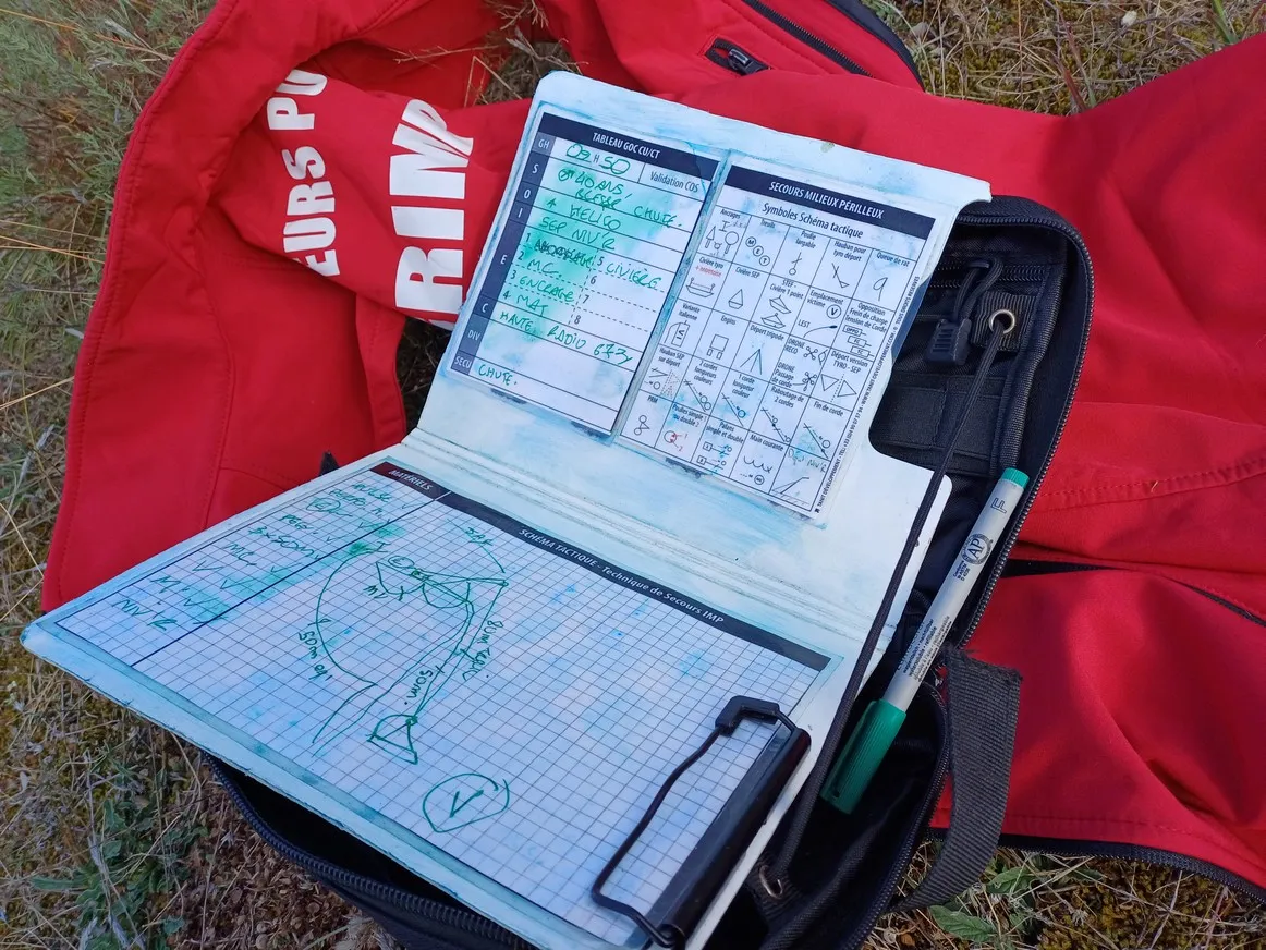 Premier arrivé sur place, le chef d'unité Étienne Brisset repère la victime. En quelques coup de crayon il dessine sur un carnet la topographie des lieux et imagine déjà les moyens matériels. À l'aide d'un talkie-walkie, le sergent-chef ordonne la liste des besoins :