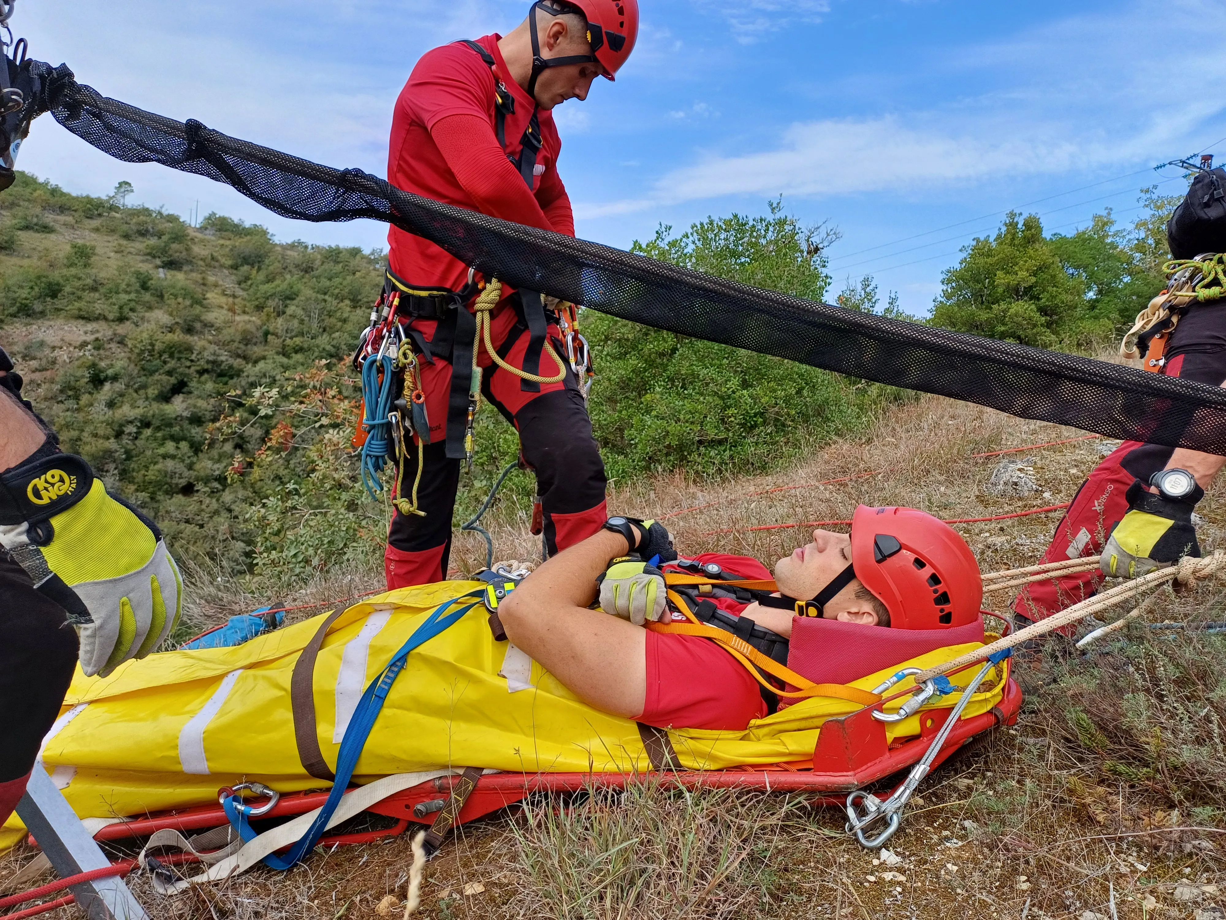 Cette fois c'est bon, deux pompiers peuvent descendre sur corde jusqu’à la victime. Pendant ce temps un mâts de déport équipé d'une poulie est monté et installé près du bord de la falaise. Une main courante permet d'assurer la sécurité des pompiers qui l'installent. Une fois le dispositif prêt, la civière est envoyée en contrebas. Le chasseur, victime fictive de cette opération, est placé dans la civière. Il sera remonté à l’aide d’un treuil électrique via des cordes que les pompiers tirent en parallèle à bout de bras.