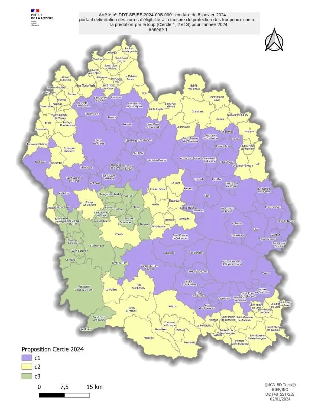 La carte 2024 des cercles de présence du loup vient d'être publiée. Elle est divisée en trois niveaux qui dépendent du nombre d'attaques enregistrées les années précédentes. Chaque niveau détermine le nombre de mesures soutenues par l'Etat pour protéger les élevages. Dans le premier cercle, le niveau le plus élevé, cinq moyens de protection sont recommandés, dont l'installation de parc électrifié ou le gardiennage renforcé.